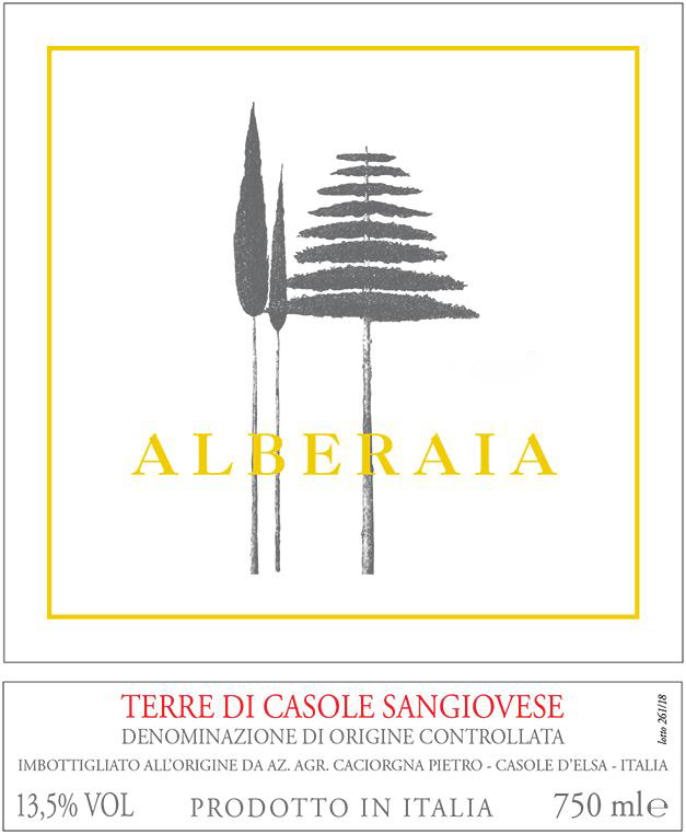 Vineyards are in Casole d'Elsa, in the province of Siena. The vineyard exposure is south - southeast and the elevation is 250 meters about sea level. The Sangiovese clones are F9, selection massale, VCR23, VCR24. The term "Alberaia" indicates a row of trees, normally along the river, as in this territory, along the Elsa river, giving its name to a rural area where an ancient local Fair has always come to life: the fair dell'Alberaia.