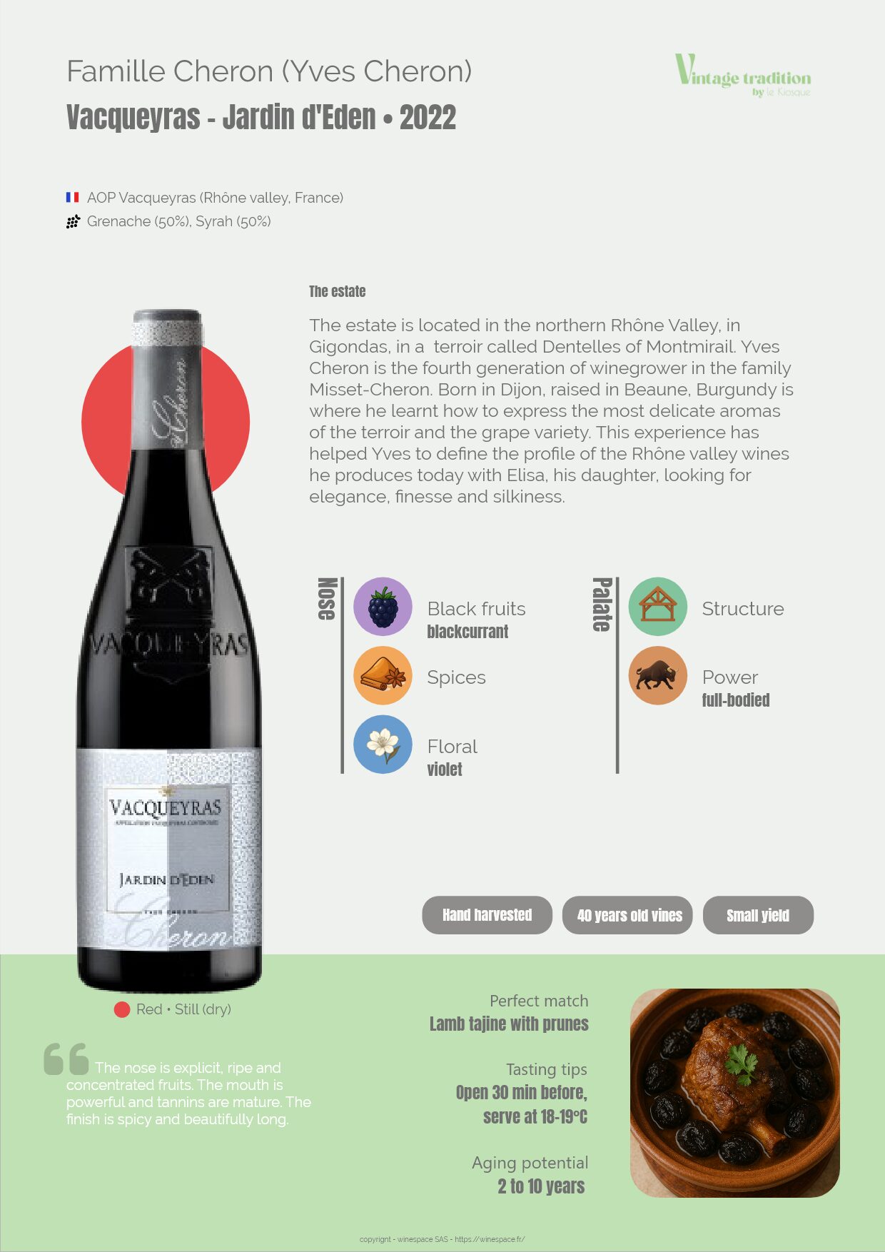60% Grenache, 40% Syrah. Manual harvest with strict selection in both vineyard and on sorting table before crush. Average 33 hectoliters/hectare for all domaine wines.