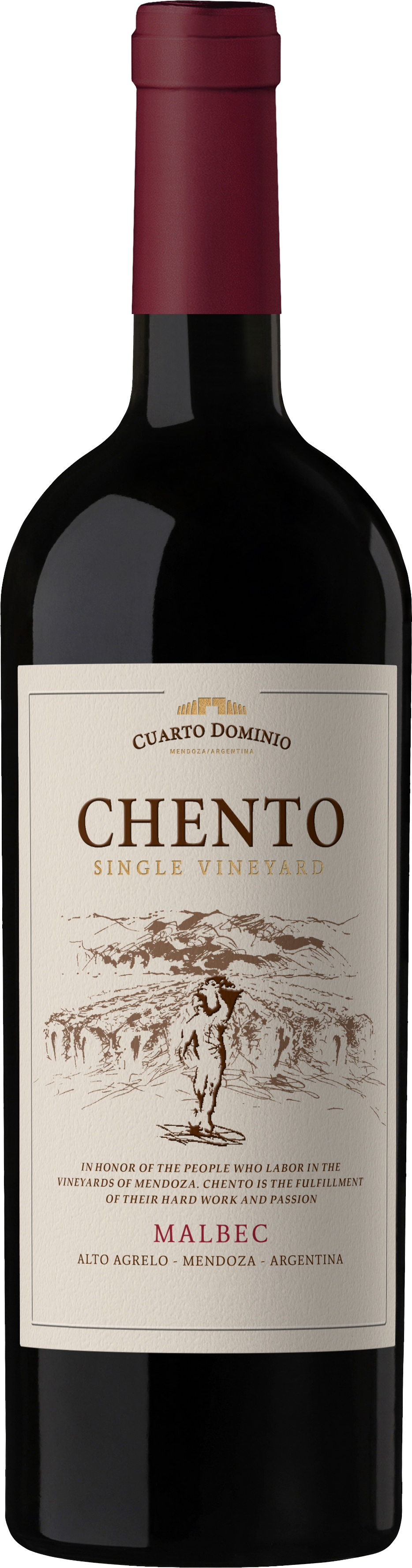 In honor of the people who labor in the vineyard of Mendoza, Chento is the fulfillment of their hard work and passion. For over a century, past generations have produced grapes and wines of quality and authenticity from the foothills of the Andes Mountains. This single vineyard wine of unique character is named after "Chento," the guardian of the estate for over 40 years. Chento Single Vineyard comes from a careful selection of the best parcels that surround the winery in Alto Agrelo vineyard.
